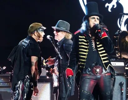 Dressed in a variety of belts, accessories and jewellery, playing his guitar low and loose, Depp plays, sings backup and even lead vocals on the David Bowie hit Heroes, which turns out to be one of the highlights of the evening. He truly gave a great performance on vocals whilst images of Bowie were projected on the screen behind him. It really was his time to shine and he did so with sincerity and coolness.